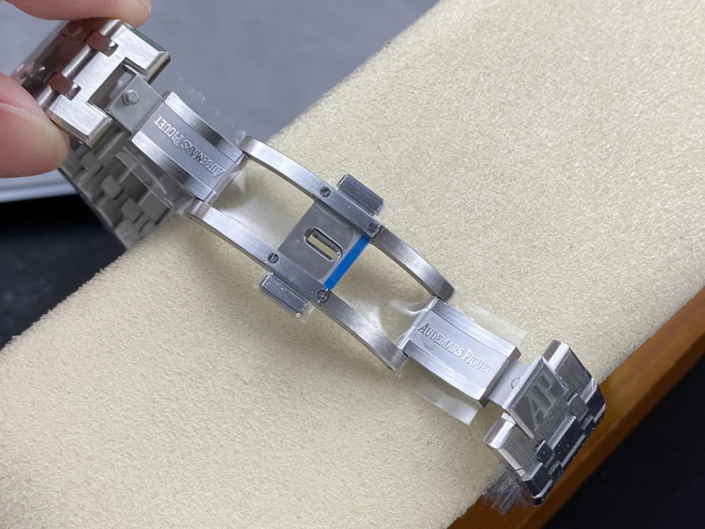Wearing comfort is another standout feature. APS has calibrated the end link buffer zone to match the genuine model almost exactly, eliminating the wrist irritation caused by overly tight links or the wobble of loose connections. The bracelet wraps naturally around the wrist, and even after 12+ hours of daily wear, there are no red marks or discomfort. The folding clasp is engraved with a crisp AP logo, operates smoothly and securely, and matches the genuine clasp’s design and feel.