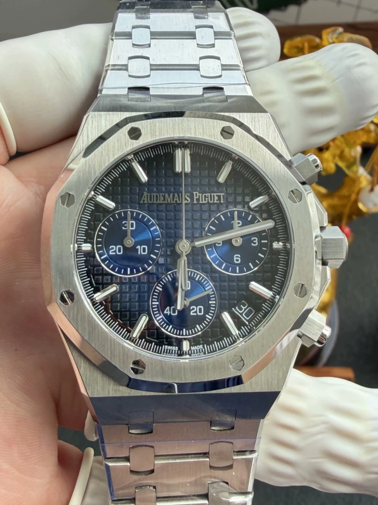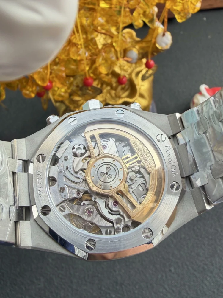 Audemars Piguet Royal Oak 26240 Chronograph, a legendary timepiece by Gérald Genta. Equipped with Dandong 4401 column-wheel movement (6.8mm thickness, fully interchangeable with genuine parts), free-sprung balance for superior stability. Features 1:1 replica dial, case, bracelet, and movement, with exquisite craftsmanship, perfect for luxury watch enthusiasts.