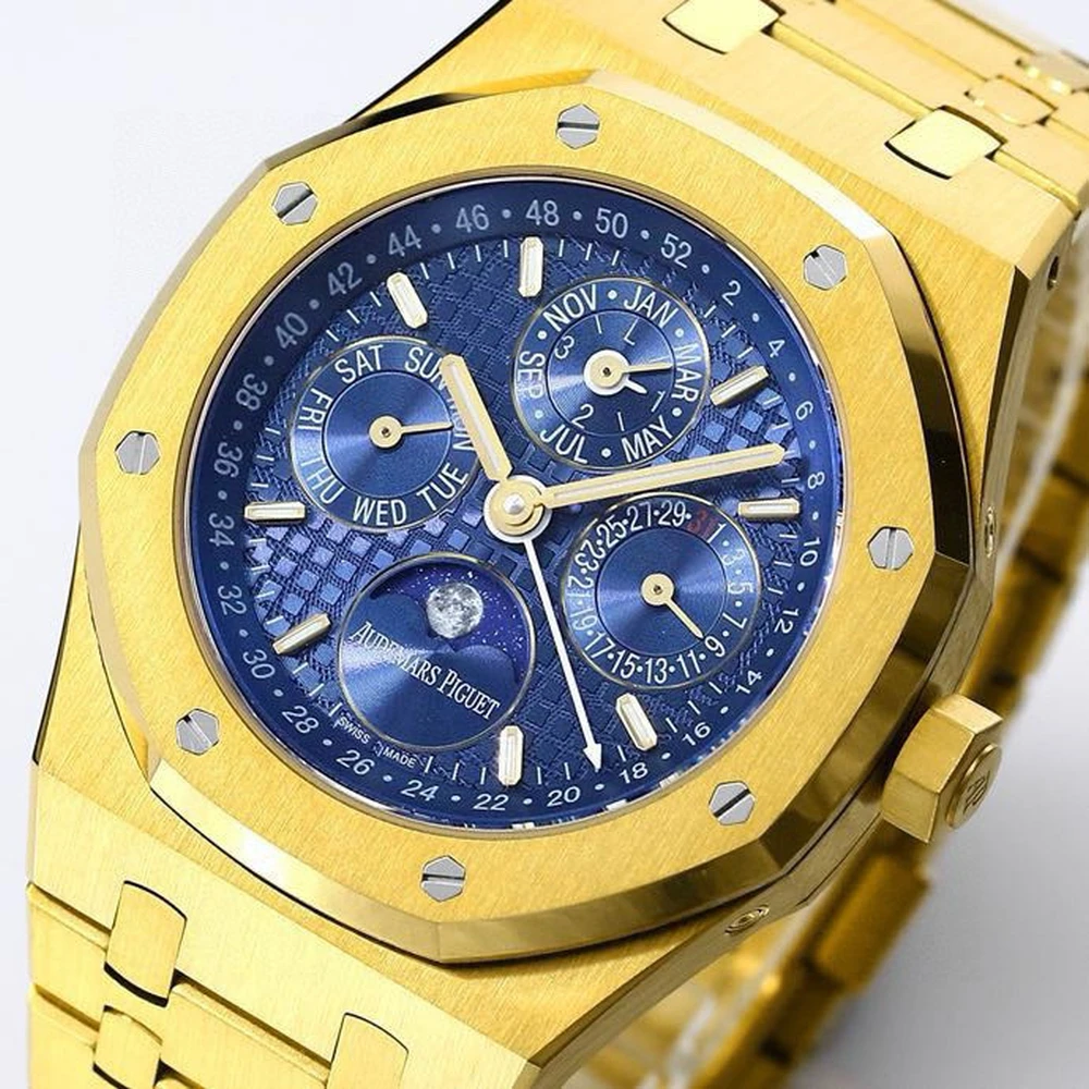 Audemars Piguet Royal Oak Perpetual Calendar watch, where elegant Blue dial meets premium 18K Gold Plated stainless steel case, perfectly presenting classic aesthetics and sophisticated mechanical craftsmanship. This watch features a 41mm case diameter and 11.4mm slim thickness for comfortable daily wear. The dial is engraved with signature Grande Tapisserie large pattern decoration, equipped with applied hour markers and faceted hands covered with luminous coating for clear reading at night. Symmetrical sub-dials display hour, minute, weekday, date, week, month, moon phase and leap year information clearly and orderly. The anti-glare sapphire crystal enhances transparency and protects the dial from scratches. Powered by modified 9015 movement customized to restore Calibre 5134 automatic winding movement, stable performance and excellent accuracy, truly a top-tier collectible timepiece.