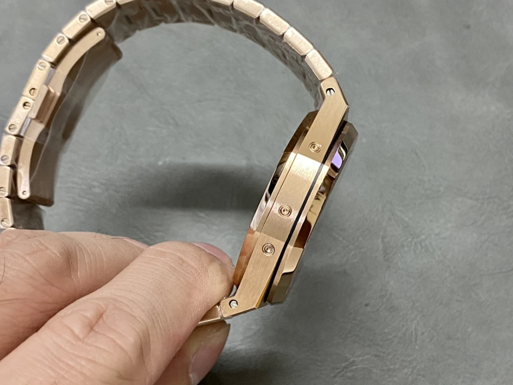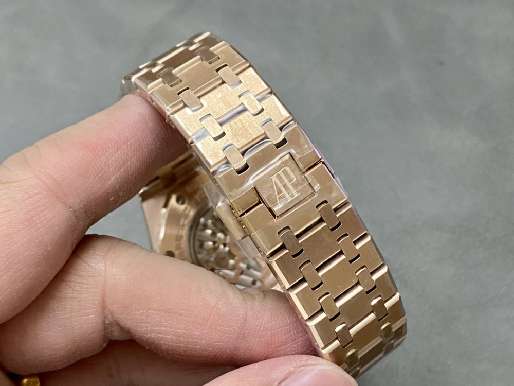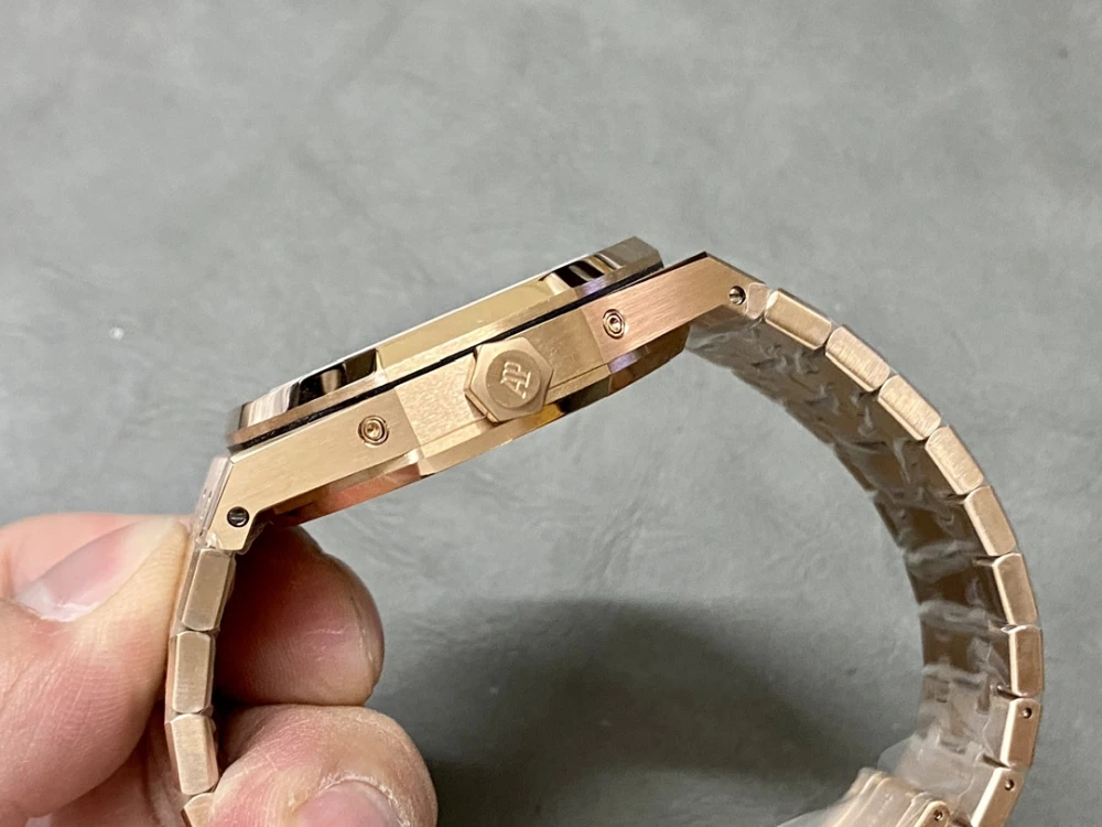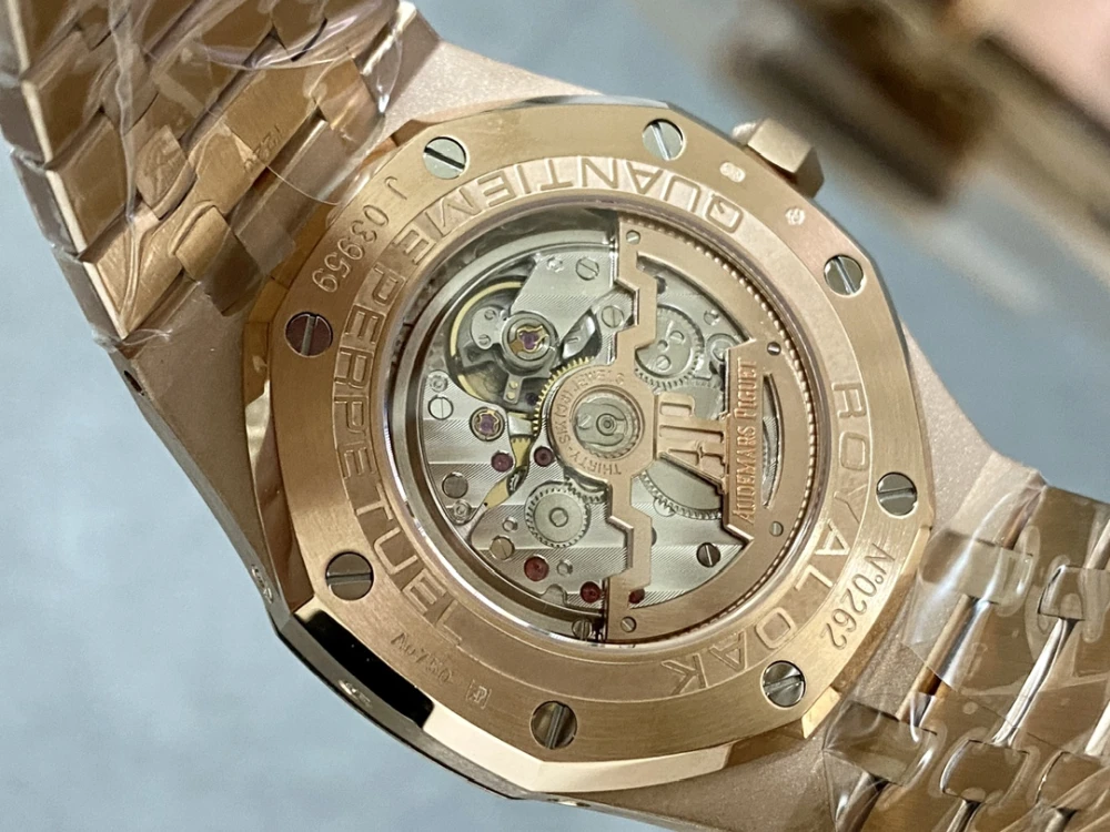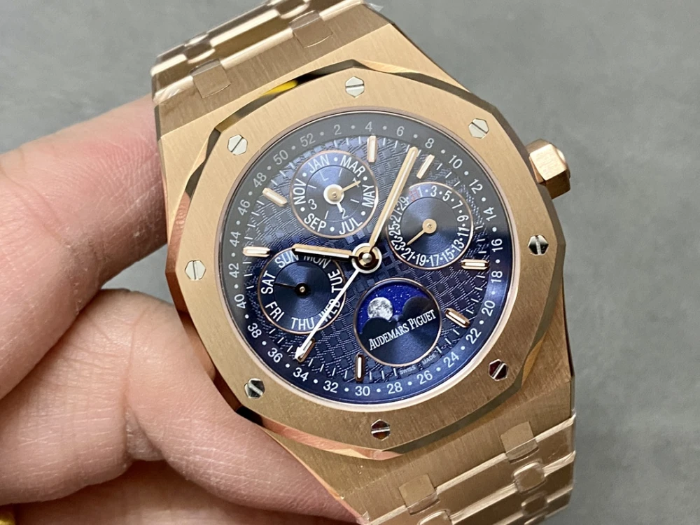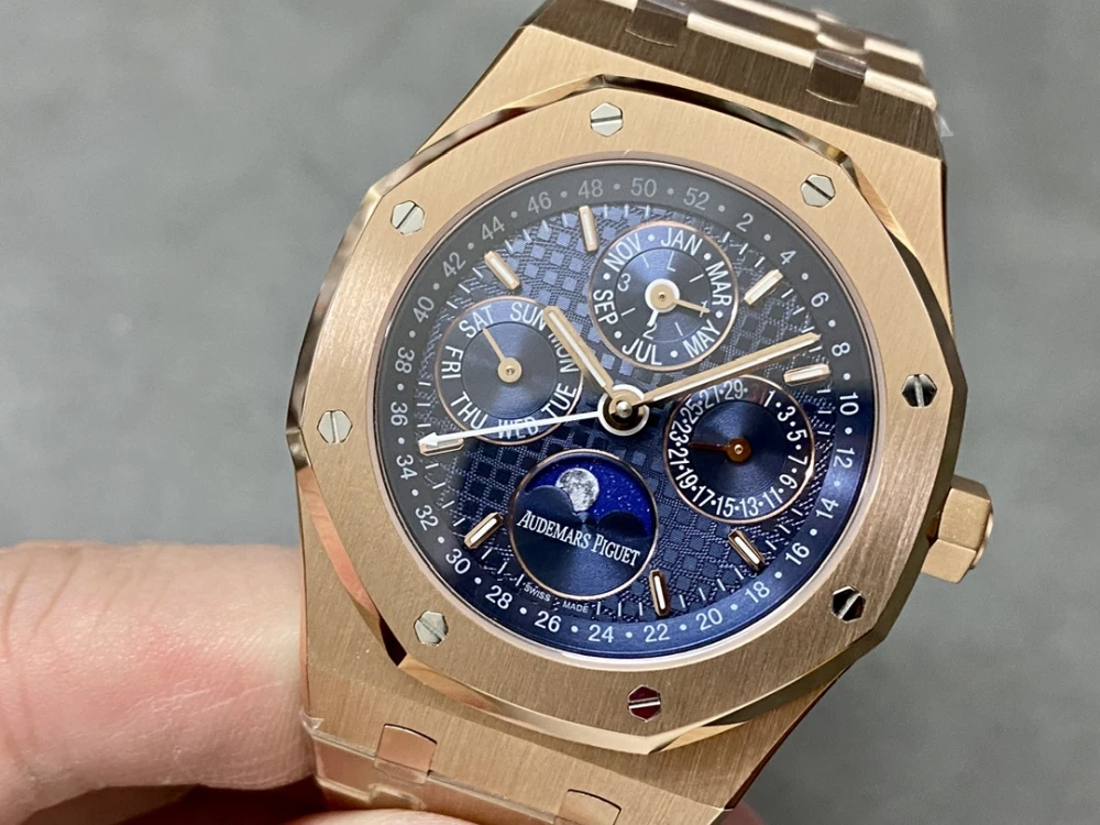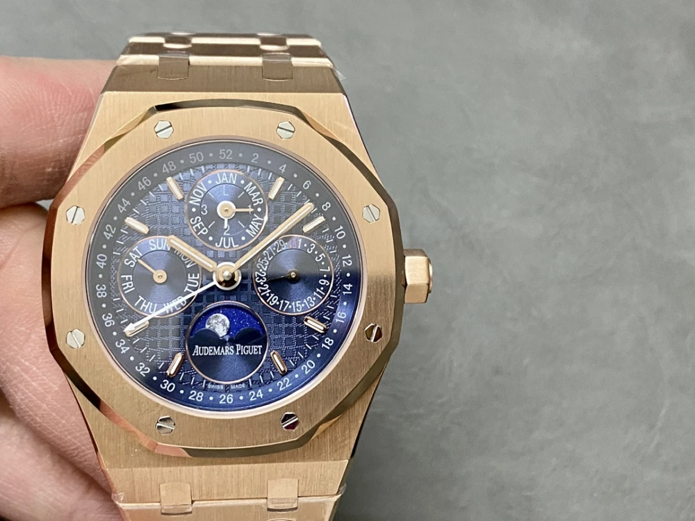Audemars Piguet Royal Oak Perpetual Calendar watch, where elegant Blue dial meets premium 18K Rose Gold Plated stainless steel case, perfectly presenting classic aesthetics and sophisticated mechanical craftsmanship. This watch features a 41mm case diameter and 11.4mm slim thickness for comfortable daily wear. The dial is engraved with signature Grande Tapisserie large pattern decoration, equipped with applied hour markers and faceted hands covered with luminous coating for clear reading at night. Symmetrical sub-dials display hour, minute, weekday, date, week, month, moon phase and leap year information clearly and orderly. The anti-glare sapphire crystal enhances transparency and protects the dial from scratches. Powered by modified 9015 movement customized to restore Calibre 5134 automatic winding movement, stable performance and excellent accuracy, truly a top-tier collectible timepiece.