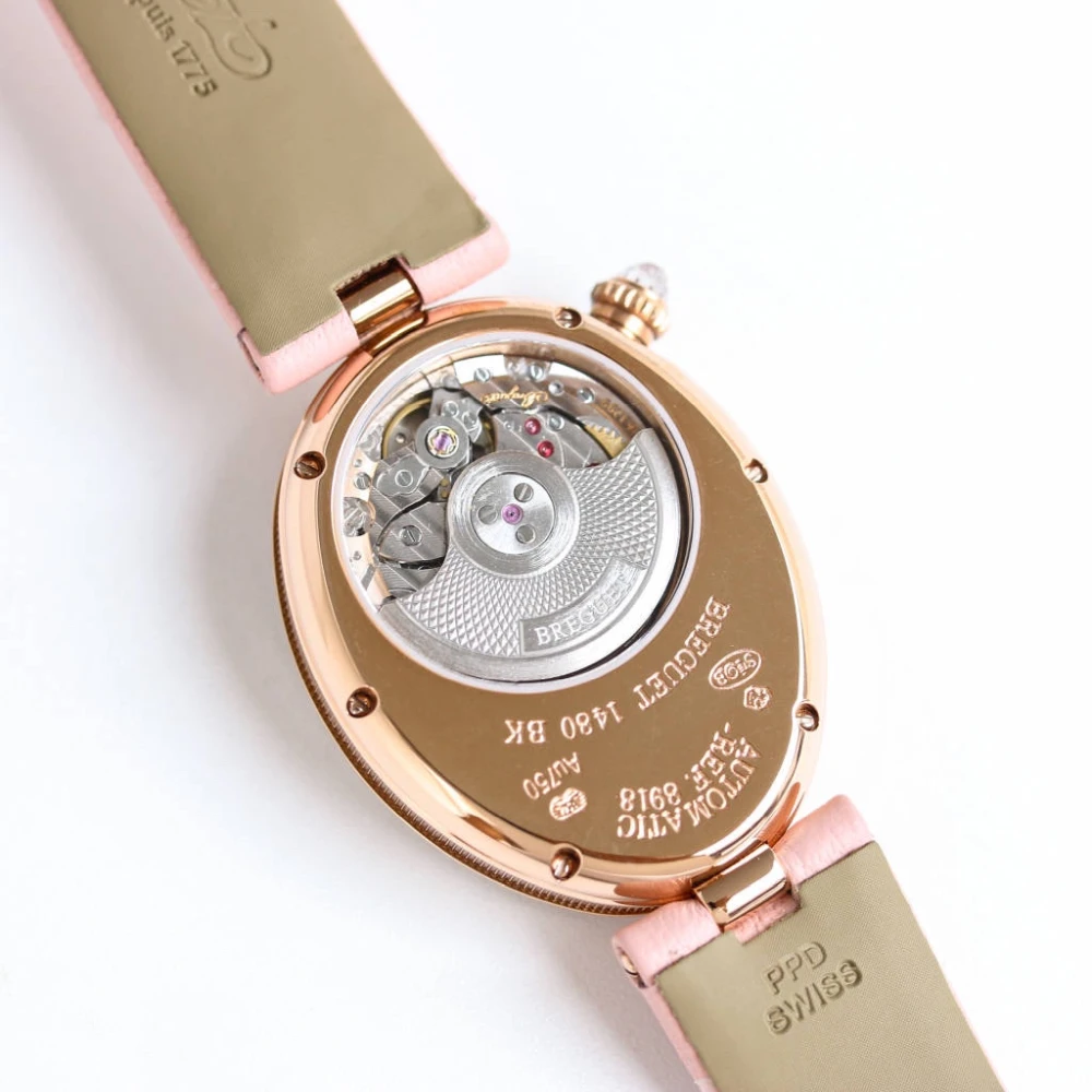 Iconic Breguet Reine de Naples 8918 (Ref: 8918BR) in 18K rose gold. Features a White dial with Arabic numerals, brilliant-cut diamond bezel and Pink Silk Wrapped in Lambskin strap. Cal.537/3 automatic movement (38h power reserve, 29 jewels) and a sapphire crystal case back. A masterpiece of Swiss haute horlogerie for discerning ladies.