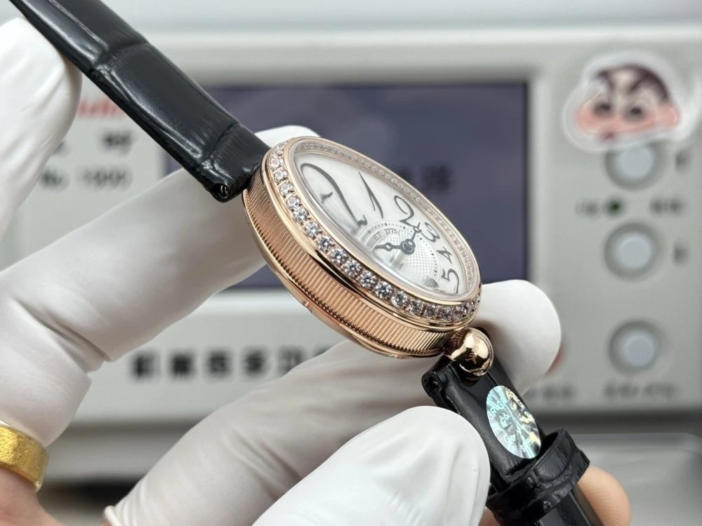 The Iconic Breguet Reine de Naples 8918 (Ref: 8918BR/58/964/D00D3L) features an 18K rose gold plated stainless steel case and a full pave diamond bezel. It boasts a stunning natural mother-of-pearl dial with Arabic numerals and a black leather strap. The elegant oval case is adorned with a coin-edge finish. The bezel and case are set with 117 Swarovski crystals (approximately 0.99 carats). The crown is set with a pear-shaped crystal (approximately 0.26 carats).