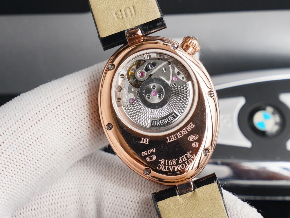 Iconic Breguet Reine de Naples 8918 (Ref: 8918BR) in 18K rose gold. Features a stunning natural mother-of-pearl dial with Arabic numerals, brilliant-cut diamond bezel and black leather strap. Cal.537/3 automatic movement (38h power reserve, 29 jewels) and a sapphire crystal case back. A masterpiece of Swiss haute horlogerie for discerning ladies.