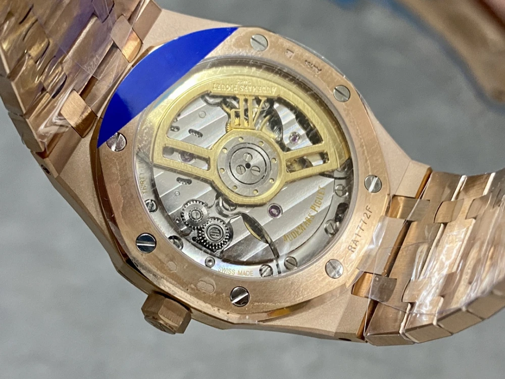 ✅ **Automatic Movement**: Powered by a high-precision Swiss automatic movement, visible through the scratch-resistant sapphire crystal case back, showing the rose gold AP rotor and intricate craftsmanship.