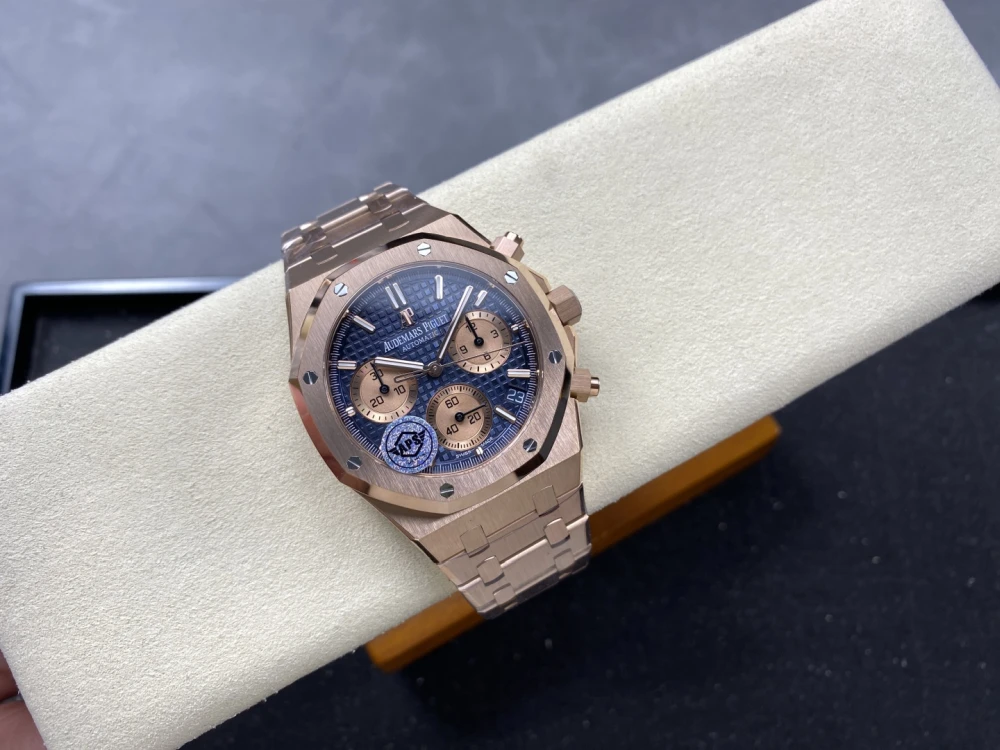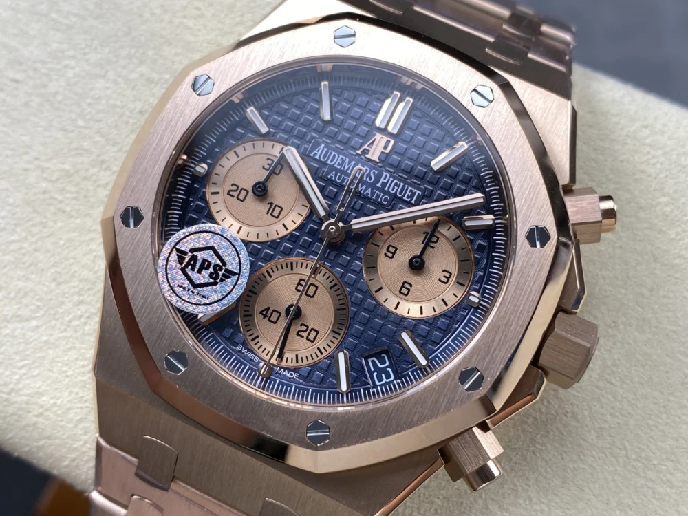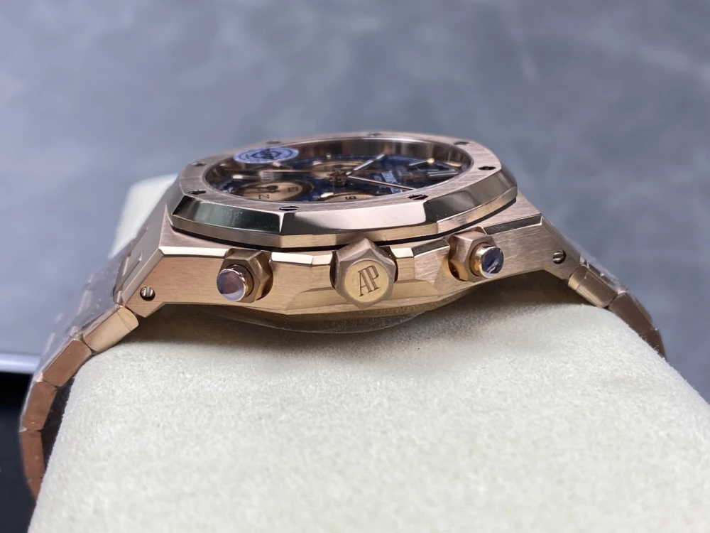The Images you see are of Actual Replica Watches, You will get exactly the same watch you see in the Images!Audemars Piguet Royal Oak Chronograph 26240 with Blue Dial 18K Rose Gold Plated Stainless steel automatic watch -super clone Front View  Sub-dials and Date Window Detail of Audemars Piguet 26240 Royal Oak Chronograph Blue dial AP Royal Oak 26240 1:1 Replica Dial Close Up with Grande Tapisserie Texture Audemars Piguet Royal Oak 26240 in Blue dial Full View Gérald Genta Iconic Design AP Royal Oak 26240 in Blue dial Full Watch 18K Rose Gold Plated Stainless Steel Bracelet Luxury Sports Watch Audemars Piguet Royal Oak Chronograph 26240 with Blue Dial Crown and AP Logo AP Royal Oak 26240 in Blue dial Case Side View Brushed Finish and Profile DetailAP Royal Oak 26240 Bracelet Inner Structure and Material Detail