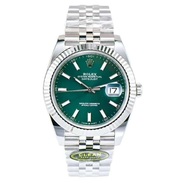 Rolex Datejust 41mm 126334 904L 1:1 Best Edition Green Dial on Jubilee Bracelet Replica Grade:5A 1:1 super clone Factory: Clean/ARF/VS Factory Size : 41mm Movement: Asian Super Clone 3255 Automatic Movement at 28800 vph, 72 hours full power reserve Functions: Hours, minutes, seconds and date display Case: 1:1 high quality 904L stainless steel, screw-in back and crown, deep and double line engraved rehaut, brighter and more accurate engravings, random serial number engraved at 6:00 of the rehaut. Different random serials Crystal: Scratch-proof sapphire crystal with anti-reflection coated 2.5x cyclops (Swiss standard, double-sided, same as genuine) the cyclops is very clear as genuine. Dial: Superlumed dial and hands in correct blue color Bezel: Fluted stainless steel bezel, same shape as genuine Strap: 904L Stainless steel rolex Jubilee Bracelet Clasp: Deployant clasp Waterproof >50 Meters